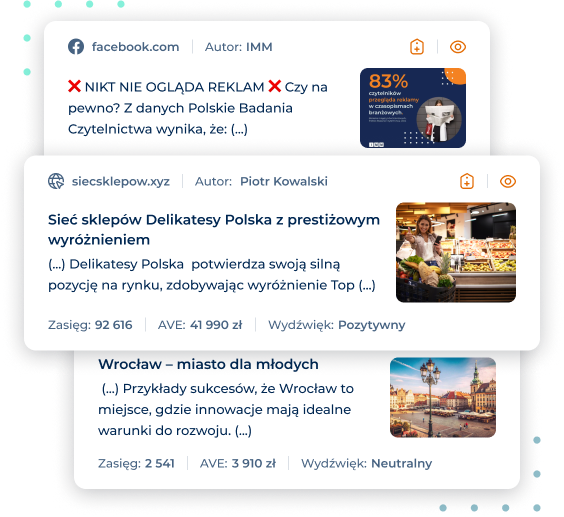 W każdej chwili możesz połączyć monitoring reklam z monitoringiem informacji oraz sponsoringu, a wyniki medialności przeglądać na Platformie IMM. Wszystkie dane do analizy działań marketingowych znajdziesz w jednym narzędziu. Podajemy dane oparte na aktualnych cennikach wydawców i nadawców a wyliczanie wartości nie jest sztucznie zawyżane, jak to ma miejsce u niektórych dostawców. Przy materiałach prezentujemy cenę, jaką należałoby zapłacić za spot reklamowy o identycznej długości w wybranym czasie antenowym lub reklamę w prasie o takiej samej powierzchni w gazecie lub magazynie.
